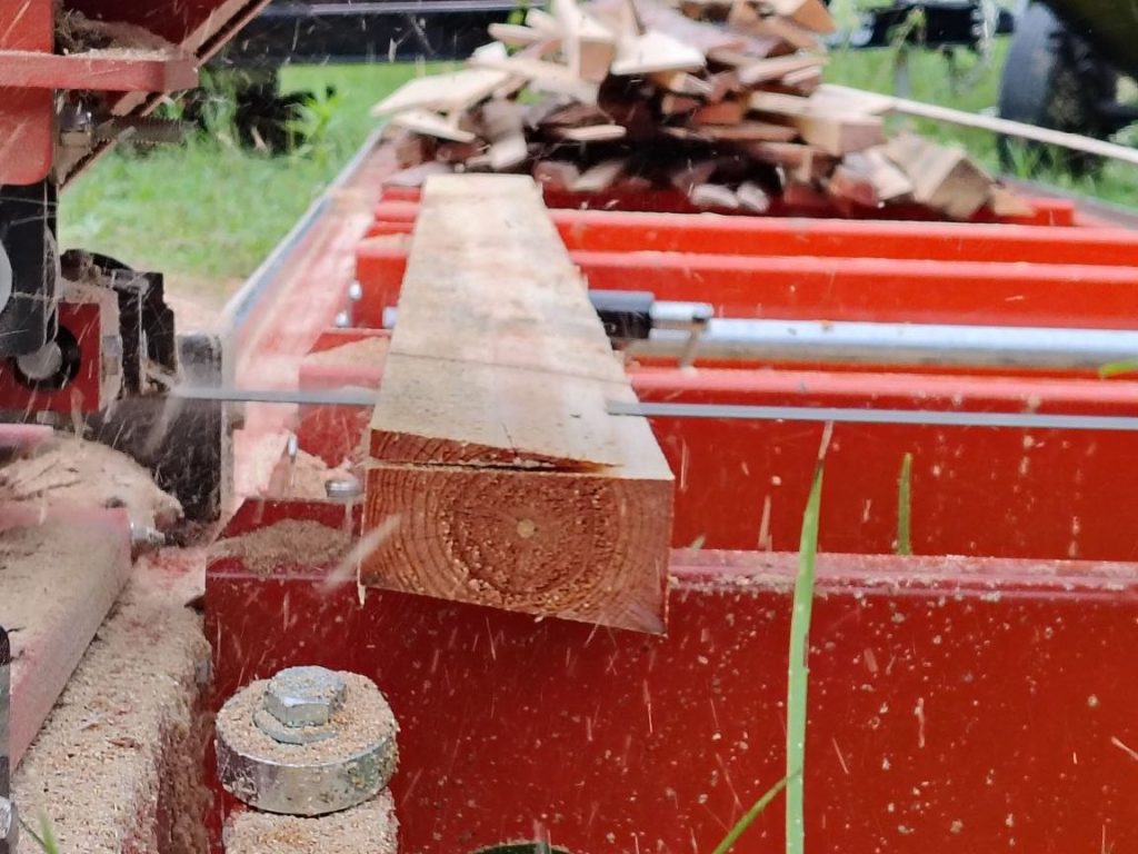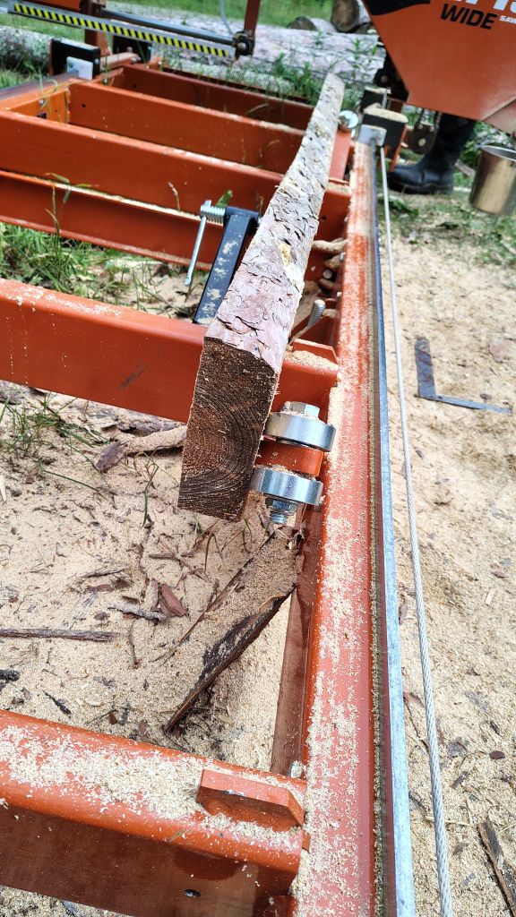 A while back, we had the opportunity to harvest some really spindly, small red pine from a grove which had never been thinned. A custom sawyer milled them for us at 2 1/4″ to give us the chance to use them for something. That time never really came because it’s very tedious to cut live edge off a board with a table saw. Today, we have the sawmill to help with this and it is uniquely designed to cut rounded, bumpy edges off a piece of wood! Just clamp it in and it is held securely while a flat, straight cut is made.